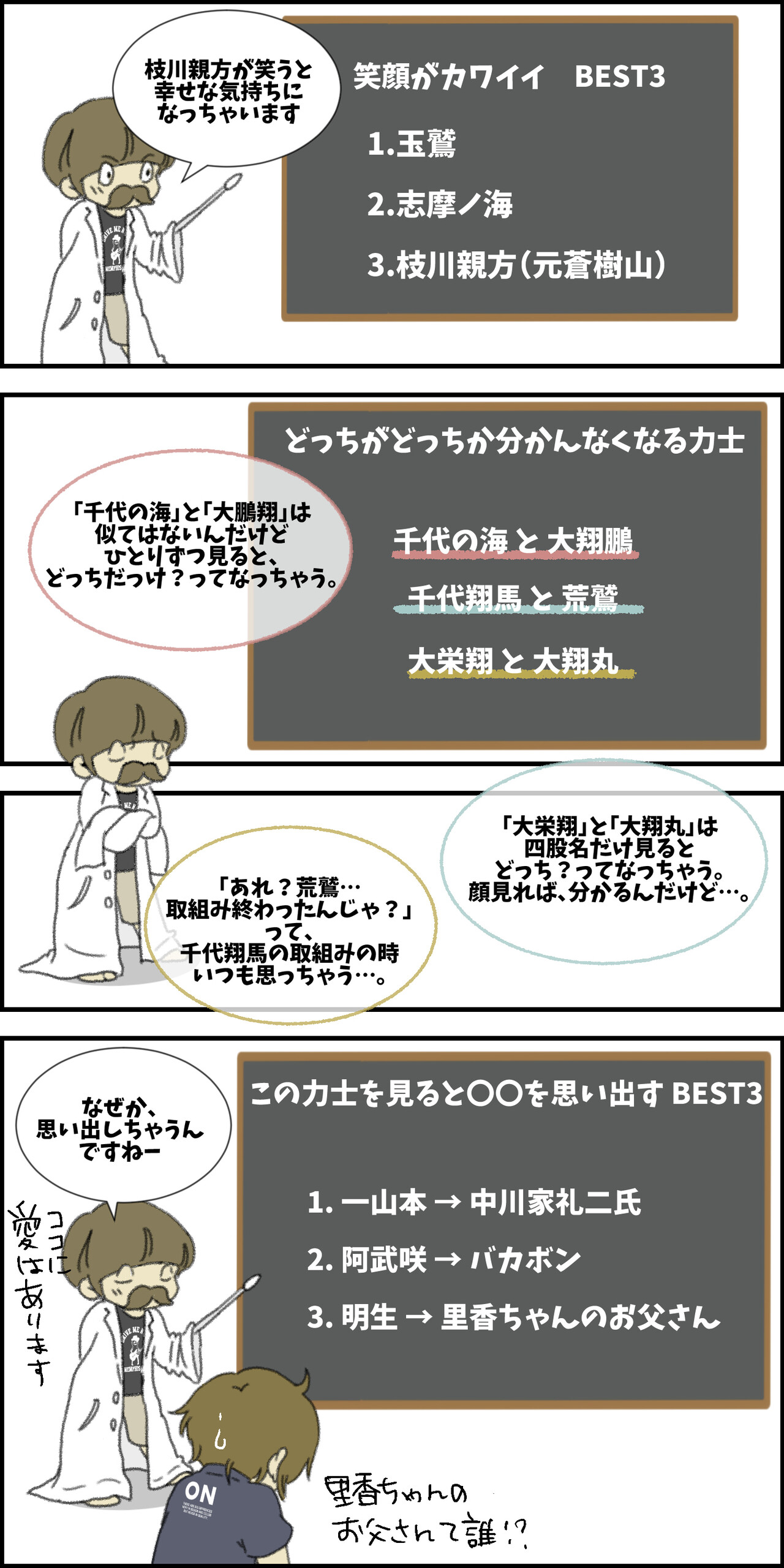 新!?おすもう講座 2019/07/31 出がけに、ヨメに相撲の話を振ってはいけない。 お相撲先生2016年のランキングはこんな感じでした。 春場所初日(2017年)何かと盛り上がる初日です。 「おすもう先生!」カテゴリの最新記事 < 前の記事次の記事 > コメント コメントフォーム 名前 コメント 記事の評価 リセット リセット 顔 星 情報を記憶 コメントを投稿する